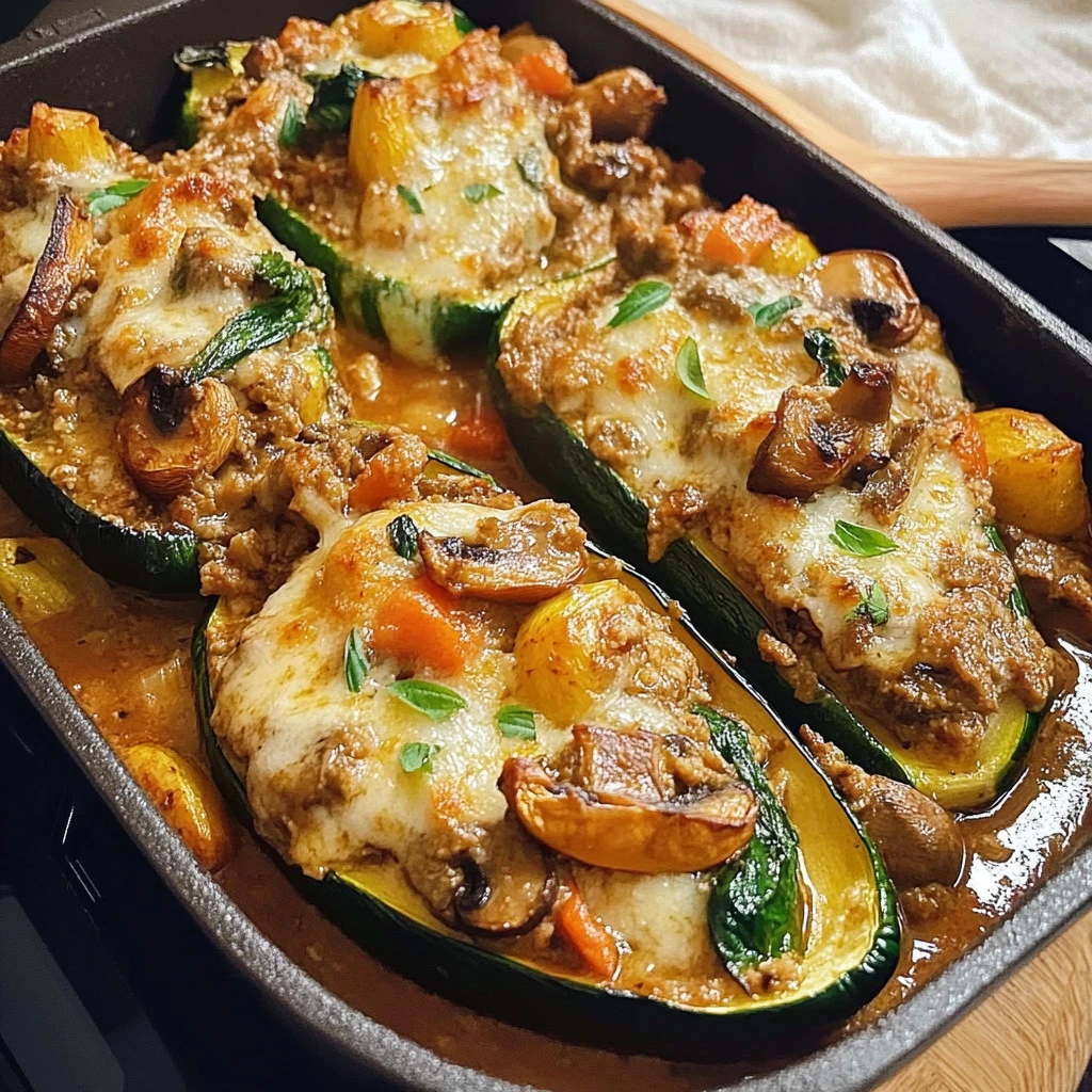 - Fill the zucchini boats with the mixture and place them in a baking dish.